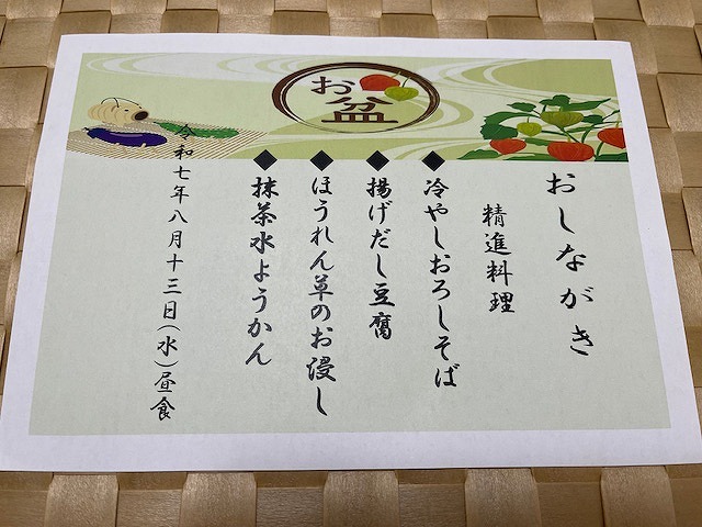 2025年8月13日(水) 昼食にて。 今日は、お盆という事で、 精進料理を皆様に召し上がっていただきました。 ~ おしながき ~ ・冷やしおろしそば ・揚げだし豆腐 ・ほうれん草のお浸し ・抹茶水ようかん 毎日暑い日が続いているので、 口当たりの良い【冷やしおろしそば】は、 ご利用者様にも大好評でした♫😄 今日はご先祖様に手を合わせ 私もお参りしたいと思います♫😊