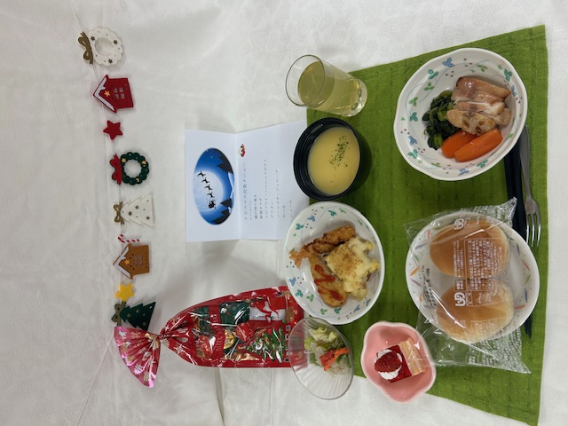 12月24日の昼食はクリスマス会食でした🎅 ✨クリスマス会食献立✨ ロールパン 鶏の照り焼き 野菜のサラダ エビフライ・ハッシュドポテト グラタン コーンポタージュスープ ケーキ ジュース ボリュームがありましたが、みなさんしっかりと召し上がってくださいました😊ケーキのイチゴのトッピング喜ばれていました🍓