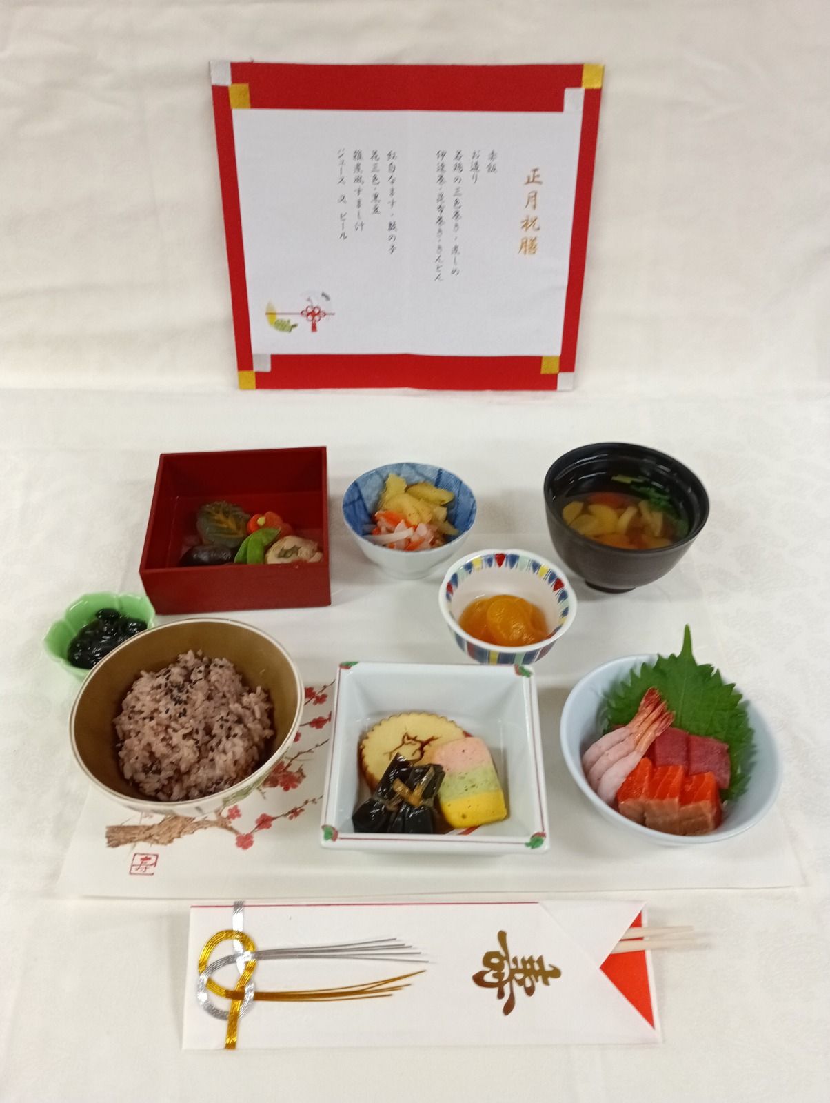 【正月祝い膳】 赤飯 お造り 若鶏の三色巻き・煮しめ・伊達巻き・昆布巻き・きんとん 紅白なます・数の子・花三色・黒豆 雑煮風すまし汁 ジュース 又 ビール